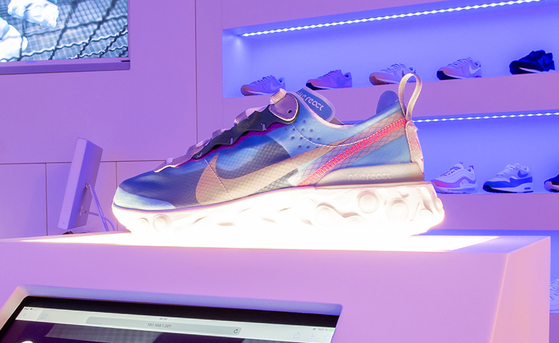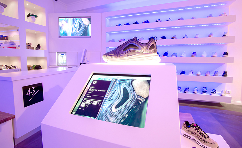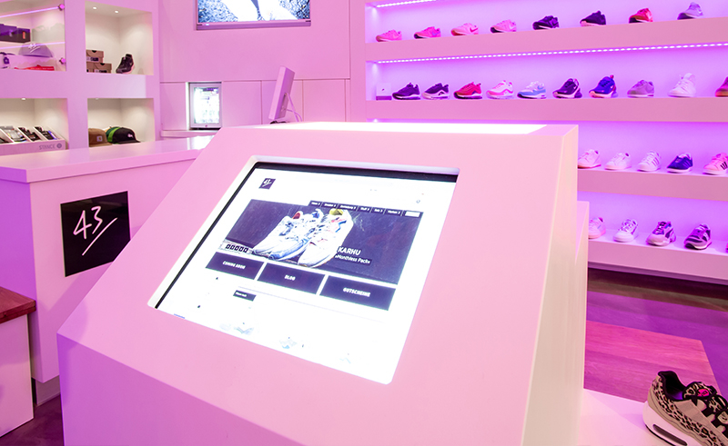 Eine Stele im Shop macht den POS zu einer interaktiven Erlebniswelt und optimiert die Kundenerfahrung. Neben einem Touchscreen ermöglicht ein Sensor, auf der Oberfläche der Stele, eine automatische Schuherkennung. Dadurch können Informationen zum Produkt einfach durch das Platzieren des Schuhs dargestellt werden. Zudem kommuniziert die Stele mit den anderen Shop-Bildschirmen, die daraufhin maßgeschneiderte Aufnahmen zum Schuh abspielen.